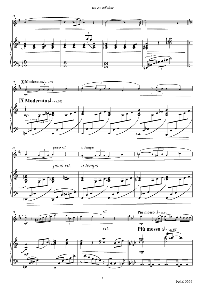 詩の最後の連は、あなたの死と、それを静かに受け止める私の気持ちで結ばれます。ピアノが死を象徴する音型を寂しげに奏でますが、程なくして溢れ出すようにCantabileとなり、共に過ごした思い出がよみがえります。やがてサクソフォンソロがロングトーンで昇るように消えていくなか、ピアノがその音型を静かに引き継ぎます。