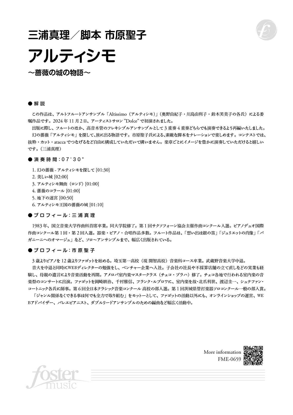 この作品は、アルトフルートアンサンブル「Altissimo(アルティシモ)」(奥野由紀子・川島由利子・鈴木芙美子の各氏)による委嘱作品です。2024年11月2日、アーティストサロン"Dolce"で初演されました。 出版に際し、フルートのほか、高音木管のフレキシブルアンサンブルで、3重奏・4重奏としても演奏できるよう再編いたしました。またファゴット・ユーフォニアムでもお楽しみいただけるよう、ヘ音記号の楽譜も同梱しています。