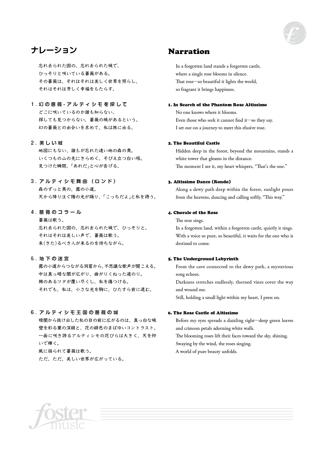 幻の薔薇「アルティシモ」を探して、旅に出る物語です。市原聖子氏による、素敵な脚本をナレーションで楽しめます。コンテストでは、抜粋・カット・ataccaでつなげるなど自由に構成していただいて構いません。楽章ごとにイメージを豊かに演奏していただけると嬉しいです。(三浦真理)