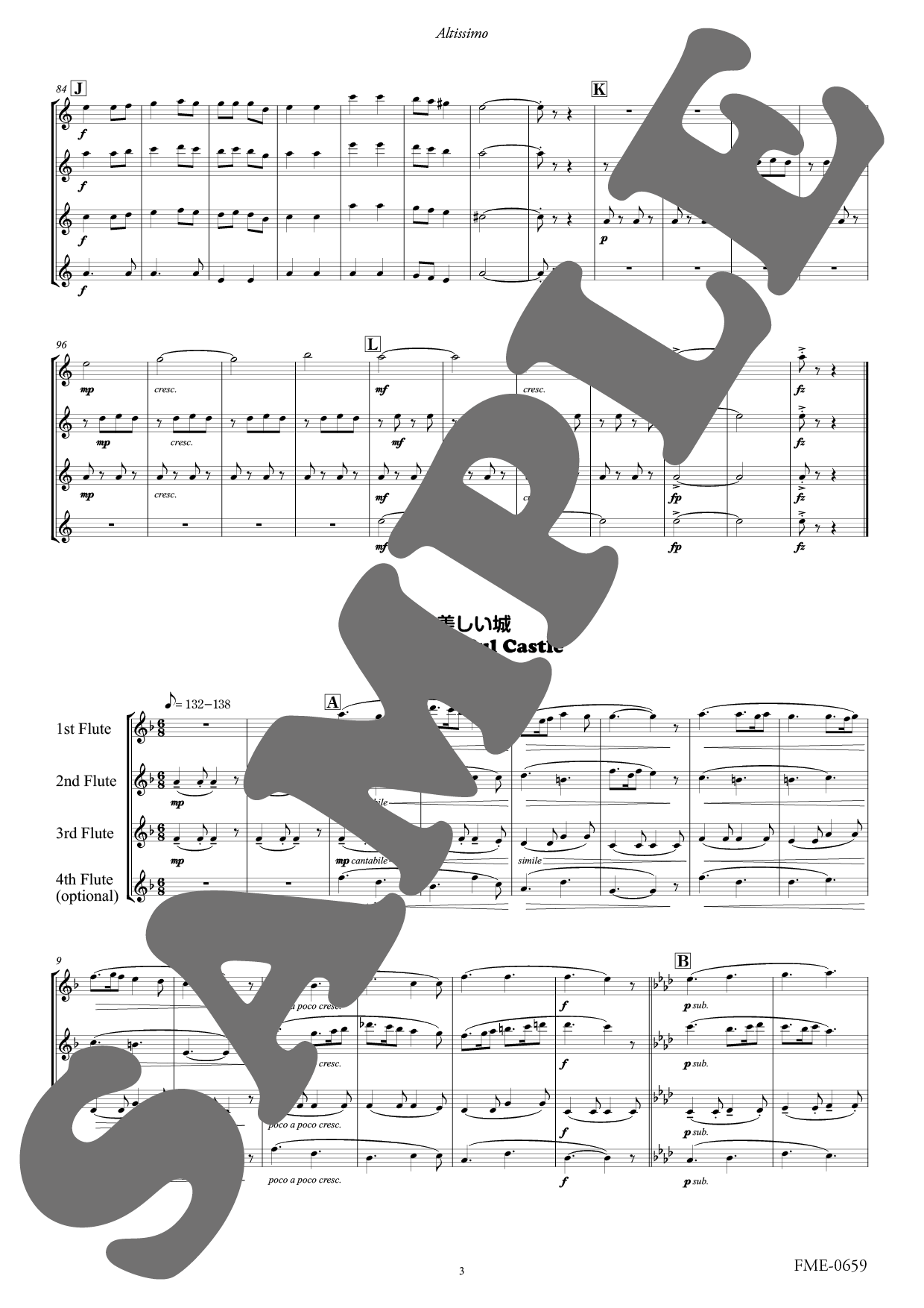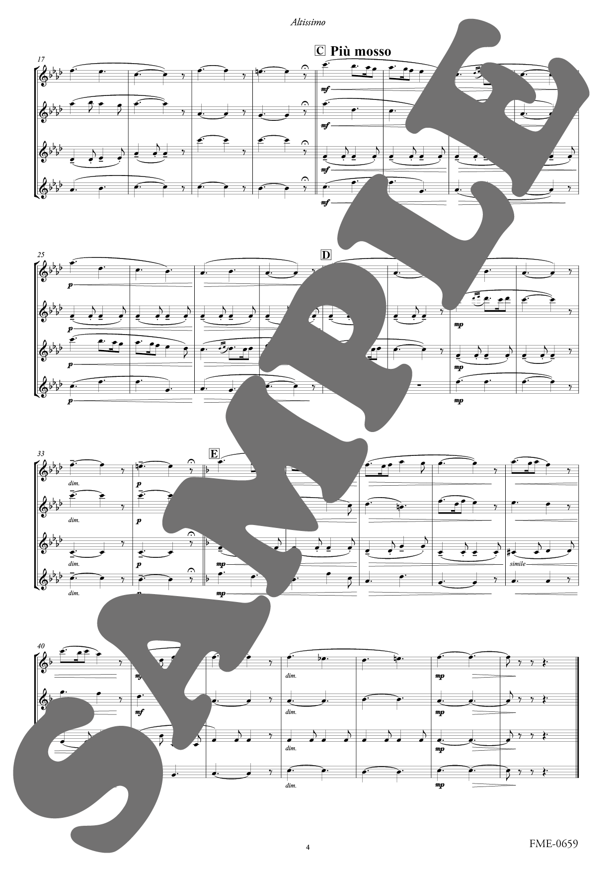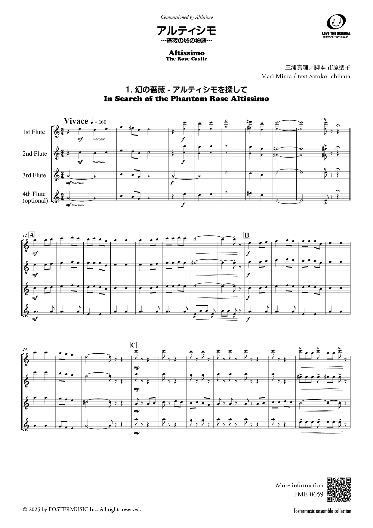 この作品は、アルトフルートアンサンブル「Altissimo(アルティシモ)」(奥野由紀子・川島由利子・鈴木芙美子の各氏)による委嘱作品です。2024年11月2日、アーティストサロン"Dolce"で初演されました。 出版に際し、フルートのほか、高音木管のフレキシブルアンサンブルで、3重奏・4重奏としても演奏できるよう再編いたしました。またファゴット・ユーフォニアムでもお楽しみいただけるよう、ヘ音記号の楽譜も同梱しています。