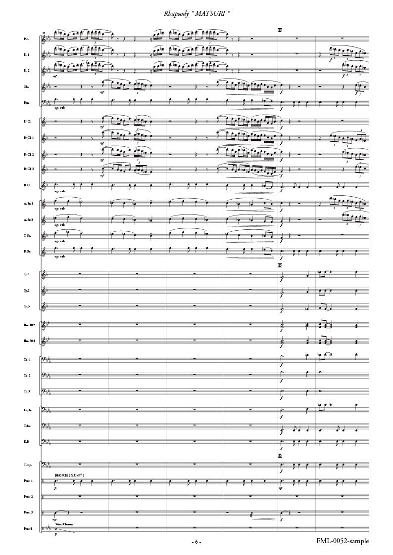 練習番号Aからの低音のリズムが、実際に大きな和太鼓などで演奏されている、この祭りの特徴的なリズムです。このリズムが、2、4、8分音符単位に変化しながら「津軽の鼓動」として曲全体に出てきます。また、練習番号Fからは「ハネト」と呼ばれる踊り手の「ラッセーラ」のかけ声のイメージでフレーズを作りました。テンポはゆっくりから始まり次第に速くなり盛り上がって終わると言うシンプルな曲ですので表現はし易いと思います。