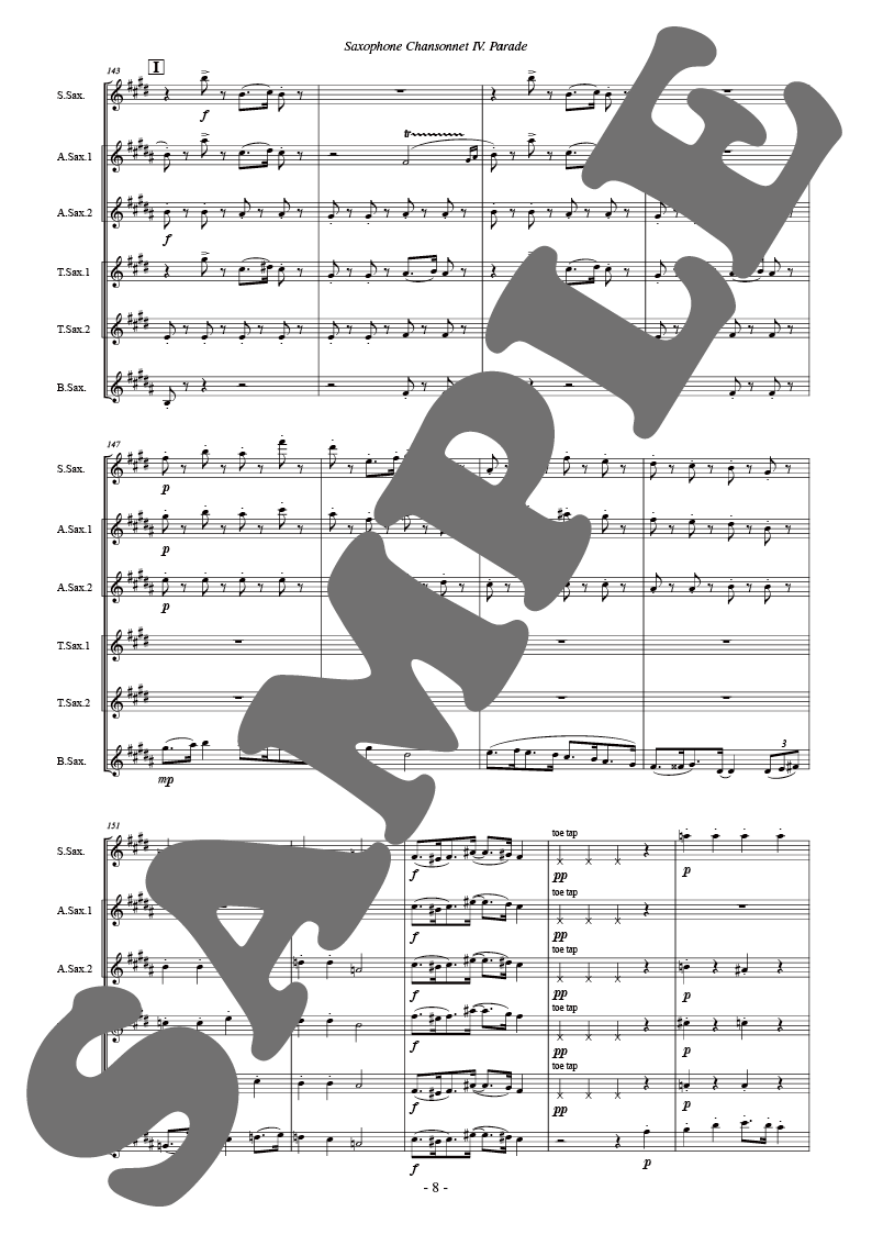 中間部は「シャッフル」のリズムのメリハリを活かしましょう。ただし若干スウィングとは違うニュアンスのリズムを用いています(正確には3連符に近い)。ノリを大事に。
