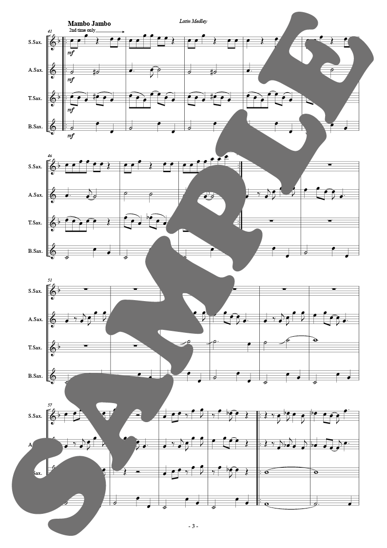 ラテン音楽の名曲「マンボNo.5」「マンボ・ジャンボ」「マンボNo.8」「セレソ・ローサ」「テキーラ」「エル・クンバンチェロ」6曲のメドレーです。