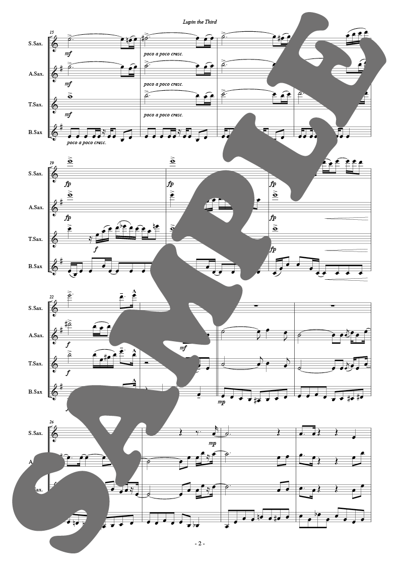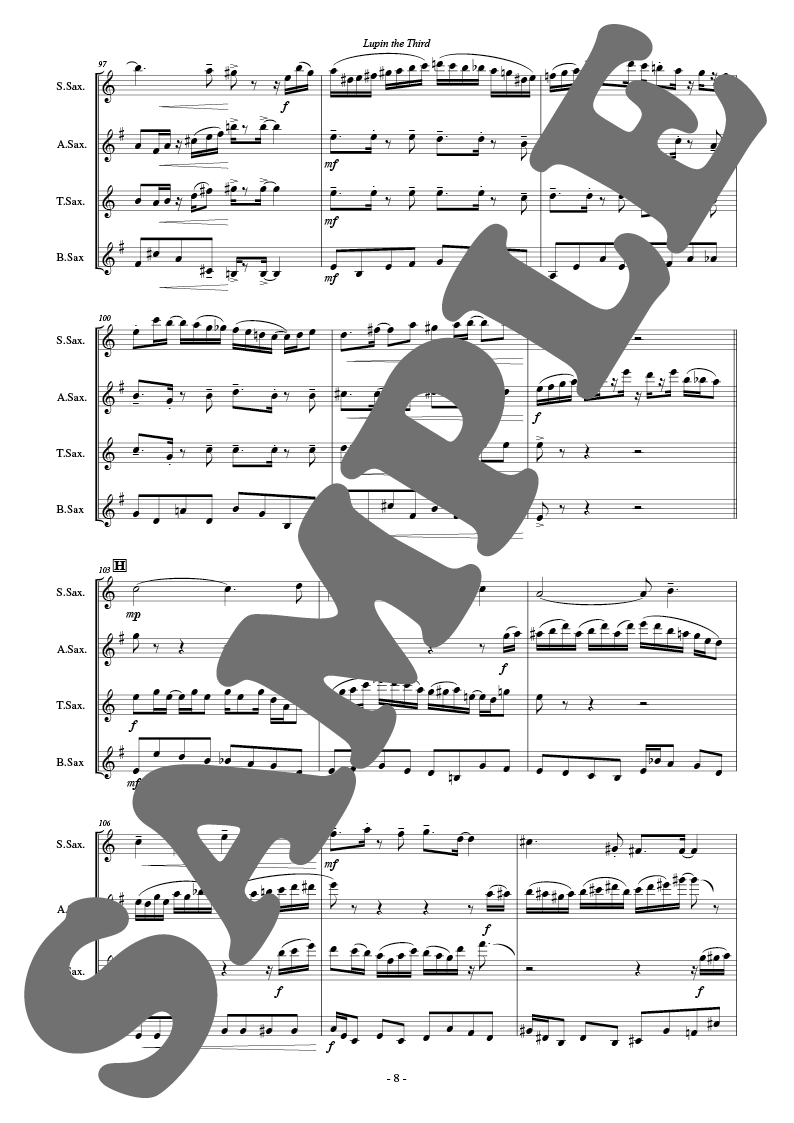 国民的人気アニメ「ルパン3世」のテーマです。このサックス四重奏版はVive!SaxophoneQuartetの初代メンバー本間将大氏が所属する陸上自衛隊第二音楽隊サックスカルテットより委嘱を受けてアレンジしたものです。オリジナルの89年バージョンでのリフをベースにしつつもの編曲者独自の構成によりサックスの機動性を存分に活かしたアレンジが出来上がりました。各楽器に見せ場がたくさんあり、また緻密なアンサンブルが要求されますが4人でノリとリズムを合わせてメリハリのある演奏を目指して下さい。