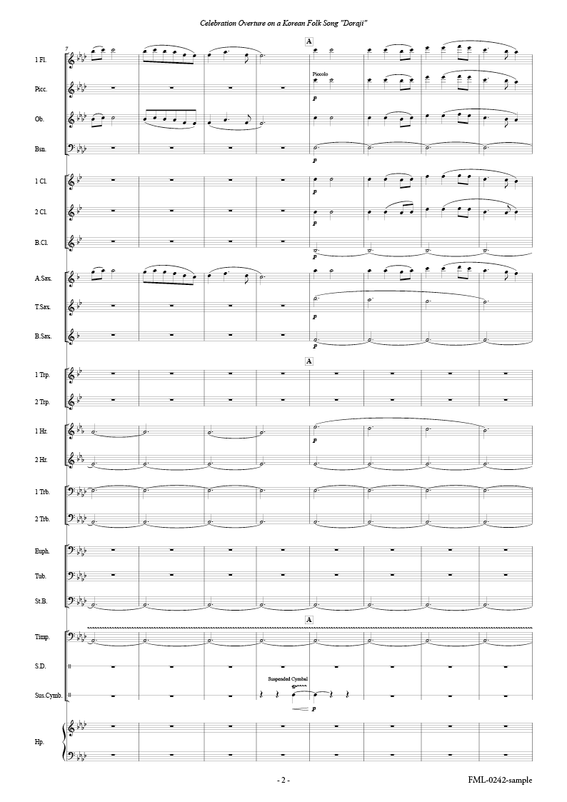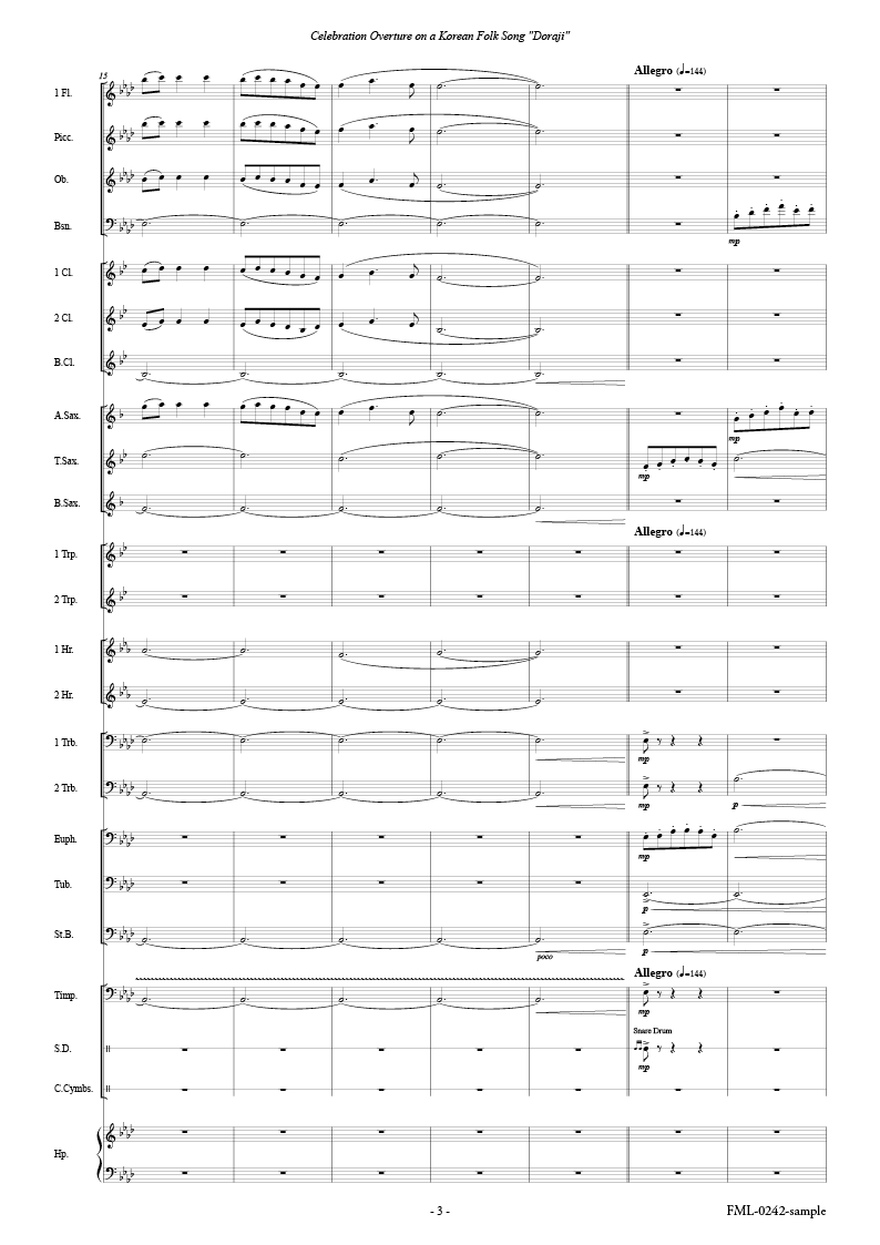 “Doraji,” together with “Arirang,” is regarded as one of the two representative folk songs of Korea. Its simple pentatonic melody and lyrics―originally about the balloon flower―convey a sense of nostalgia that transcends national borders. The melody of “Doraji” appears in the introduction, the waltzinspired middle section, and the tutti near the end, while the other sections are based on original material.