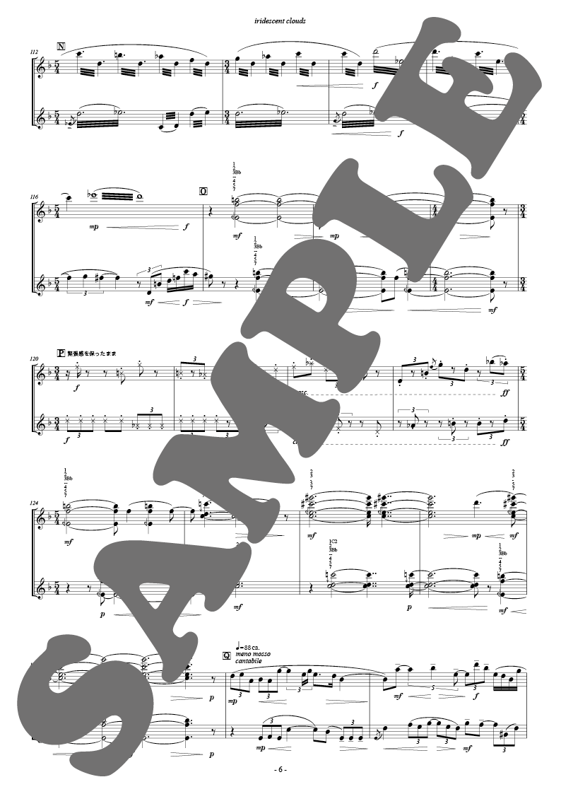 古来から「目にすると良いことが起きる」と、吉兆を表すものとされてきた"彩雲"は太陽の近くを通った雲が赤や黄色、緑に彩られる現象です。この作品は聖徳太子と太子の伝説に関係する舞楽「蘇莫者(そまくしゃ)」をテーマにと委嘱されました。拍子は「蘇莫者」の八多良拍子に近い、4分の5拍子が主ですが、それ以外は伝説や逸話から感じたことを自由に音にしていきました。それぞれのセクションの繋がりを意識して演奏していただけると、曲が立体的になると思います。太子の内に秘めた激しさや哀しみを感じて演奏していただけたら幸いです。